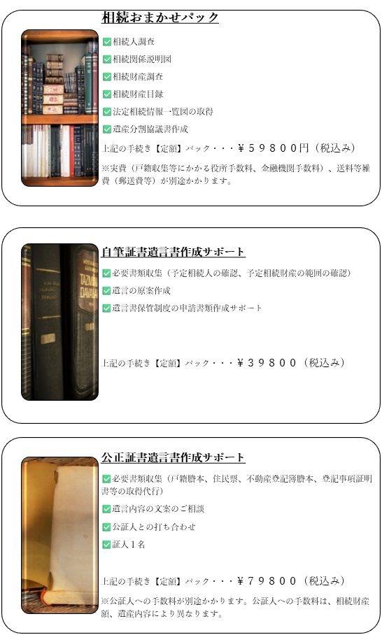 ※実費(戸籍収集等にかかる役所手数料、金融機関手数料)、送料等雑費(郵送費等)が別途かかります。
